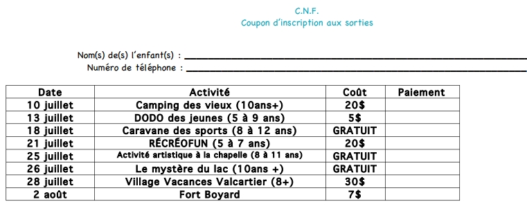 Pour inscription, imprimez le coupon et le retourner avec le paiement au bureau de la monitrice chef.